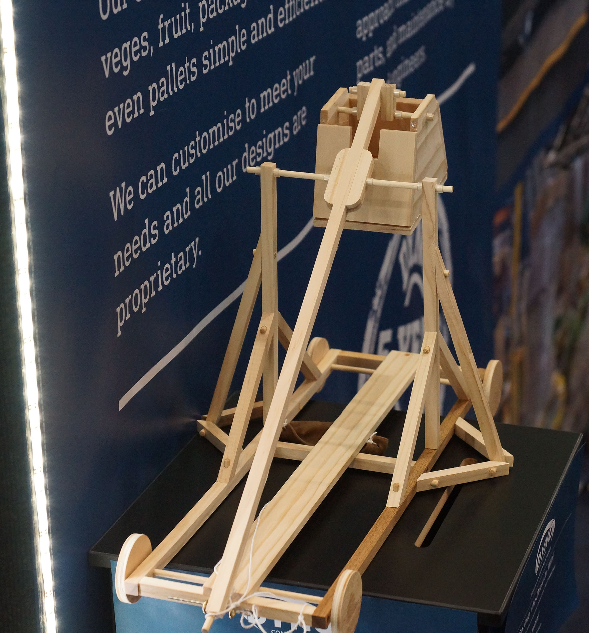 A major attraction at the Dyno stand was the trebuchet siege engine, a scaled-down version of the one designed by Leonardo da Vinci. Visitors entered a draw to win their own catapult. The trebuchet was also used in a challenge to see who could achieve the best distance. The top spot on the leader board went to Reuben Cornes, who launched a projectile 3.43 metres.